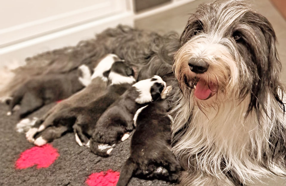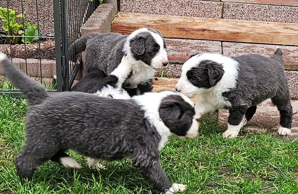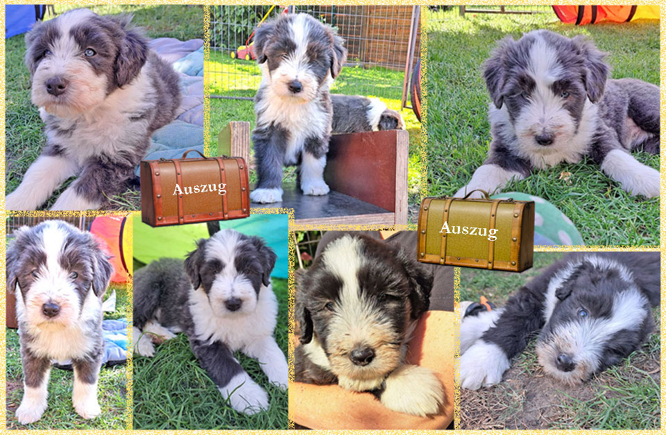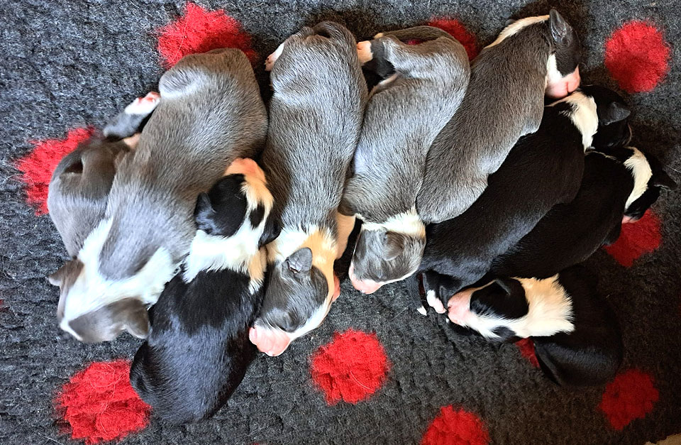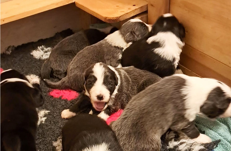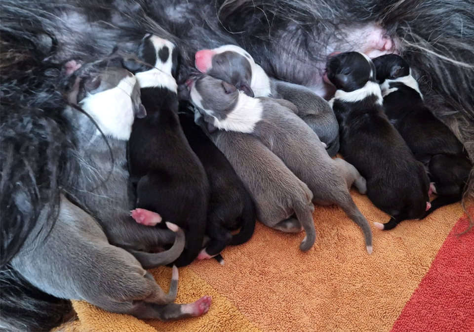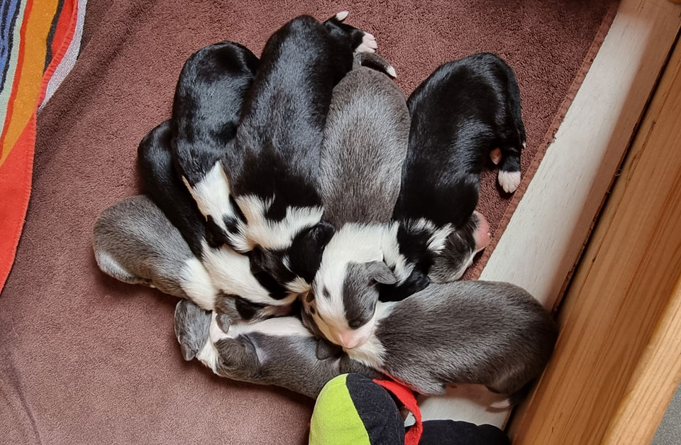 Unsere Ronja hat am 14. August ihren ersten Wurf mit gleich 9 Welpen zur Welt gebarcht. Es sind 5 Hündinnen (2 Schwarz-Weiße und 3 Blau-Weiße) und 4 Rüden (2 Schwarz-Weiße und 2 Blau-Weiße).