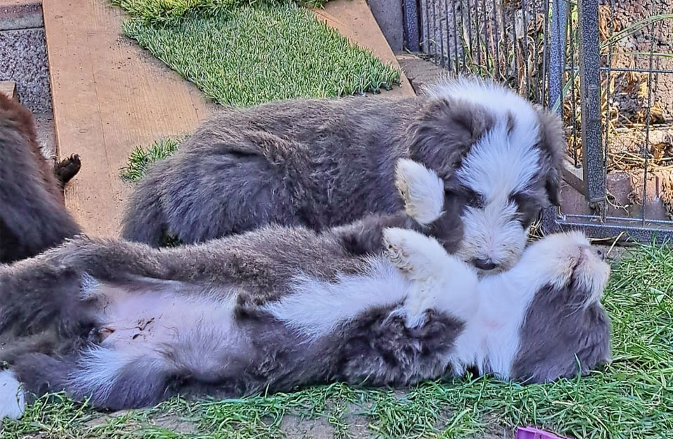 Unsere 8 Welpen lieben es im Garten zu toben, da wird sich auch schon mal gerauft.